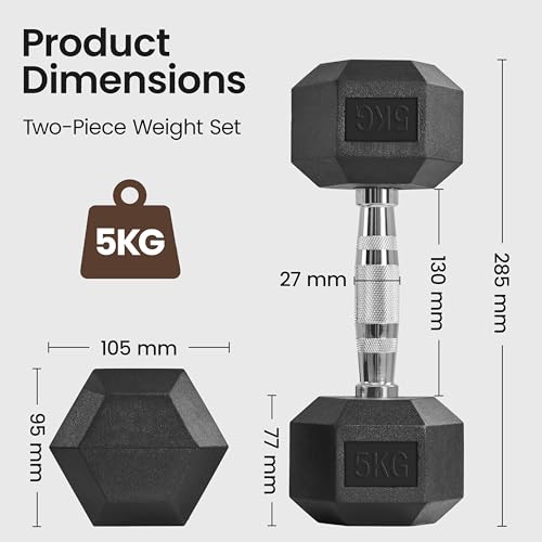 Knurled Grip for Steady Hold: The textured metal handle provides reliable traction, while the 2.7 cm grip diameter feels natural in both smaller and larger hands, allowing comfortable grip for curls, presses, and rows with this 5 kg hex dumbbell set
