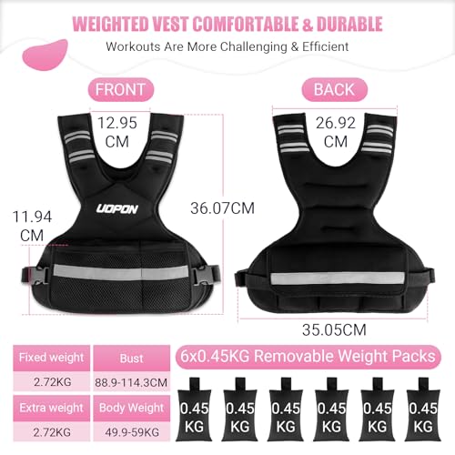 Durable Comfortable & Adjustable Weight: Our great adjustable weighted vest for women 2.72 KG on its own, adjustable weighted vest with 6*0.45KG removable weights packs, it can be adjusted to increase the weight to 5.44KG. Rucking vest for women is made of lightweight and breathable neoprene with high-quality, soft iron sand filling, provide a comfortable wearing experience. Excellent breathability ensures comfort and dryness during weight training.