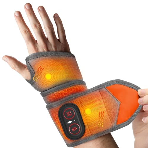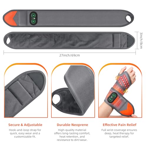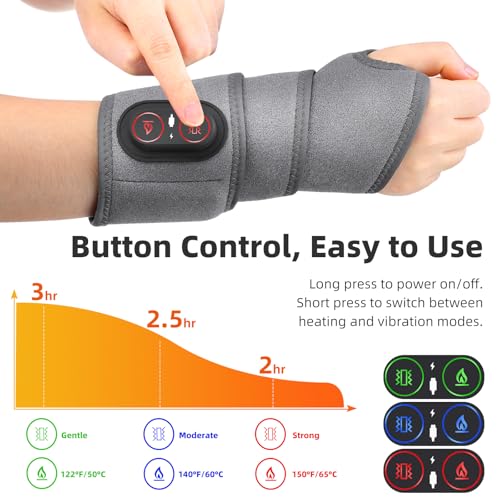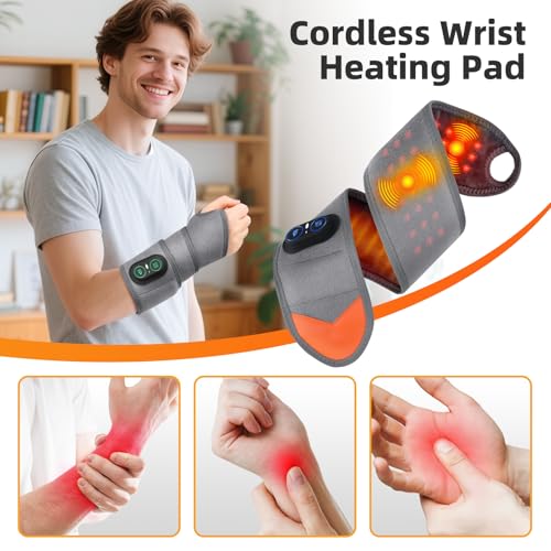 Cordless Heated Wrist Massager, Heated Wrist Support with Vibration, 3 Heats and Vibrations Modes, Red Light Wrist Brace and Hand Massager, Heating Pad for Hand, Arm, Knee, Elbow, Grey