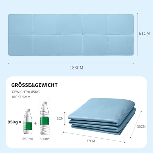 【Portable Folding】Foldable yoga mat is 37*30*6cm when folded and 183*61*0.6cm when unfolded. Exercise mat can easily fit into our gym bags and luggage for gym, picnic, travelling and other activities