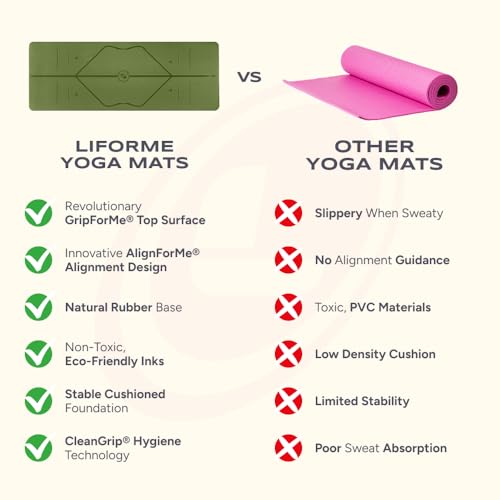 Liforme Original Yoga Mat – Free Yoga Bag Included – Patented Alignment System, Warrior-like Grip, Non-slip, Eco-friendly and Biodegradable, sweat-resistant, long, wide, 4.2mm thick mat for comfort
