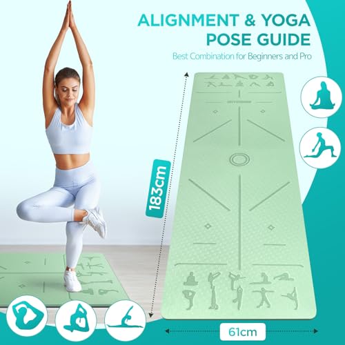 Yoga Mat with Alignment Lines,TPE 6mm Sports Exercise Mat,Non-Slip,for Gymnastics,Pilates,Home, Travel,Gymnastics Mat with Storage Straps,Yoga Mats for Women and Men,183x61x0.6cm