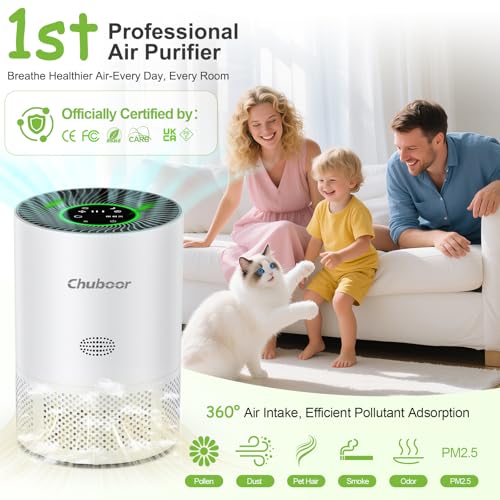🏠【𝐈𝐝𝐞𝐚𝐥 𝐟𝐨𝐫 𝐀𝐥𝐥 𝐒𝐩𝐚𝐜𝐞𝐬】The Chuboor PJ01 Air Purifier features a high-efficiency filtration system and 360° air intake design that captures 99.97% of airborne pollutants. Covers up to 1,200 ft² large room, refreshing a 120ft² bedroom every 7min, 300 ft² living room or office every 17 min, and 1200ft² space 1.5 times hourly. Perfect for bedrooms, living rooms, offices, kitchens, RVs, and basements, An ideal choice for pet owners, families with infants, seniors, and office workers, anyone looking to improve indoor air quality.