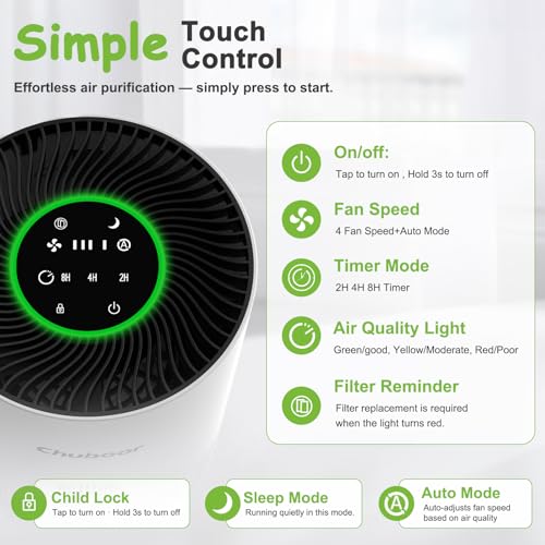 🔔【𝐑𝐞𝐩𝐥𝐚𝐜𝐞 𝐅𝐢𝐥𝐭𝐞𝐫 𝐑𝐞𝐦𝐢𝐧𝐝𝐞𝐫】Chuboor air purifier is equipped with a filter replacement indicator. You can check the status of the HEPA filter by observing the indicator light on the device (red light signals replacement). Depending on your environment and usage, we recommend replacing the filter every 4 to 6 months. For optimal purification performance, we strongly recommend using genuine Chuboor replacement filters ( search on Amazo:B0F8N92XXP to buy Original Filter).