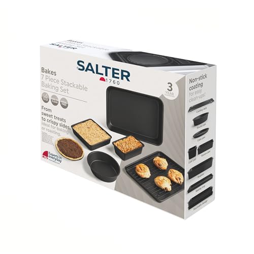 Salter Bakes Stackable 7 Piece Bakeware Set – Non-Stick with Baking Tray, Cake Tin, Tart Tin, Loaf Pan, Brownie Pan, Roasting Tin, Cooling Rack, Compact Storage, PFOA-Free, Oven Safe, Black