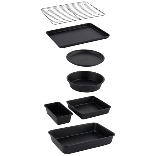 7 PIECE BAKEWARE SET: Including a 22cm cake tin, 22 cm tart tin, 22cm loaf pan, 24cm square pan, 39cm baking tray, 40cm roaster and 37cm cooling rack. Everything you need to get started and get baking!