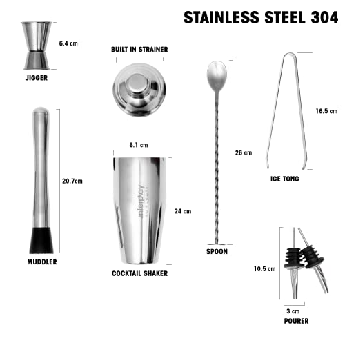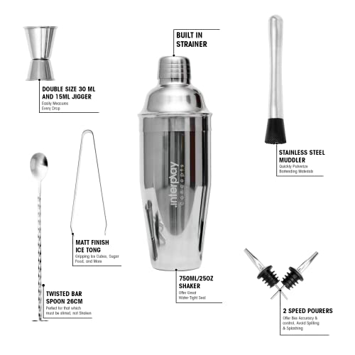 🍸【8 Pieces Cocktail Shaker Set 】 This Interplay Concepts cocktail shaker set comes in a total of 8 pieces, including a large 750ml stainless steel cocktail shaker, 1 Jigger 15/30ml, 2 bottle pourers, 1 tong, 1 muddler, and a 26cm bar spoon. This modernistic cocktail shaker set includes all cocktail making accessories.
