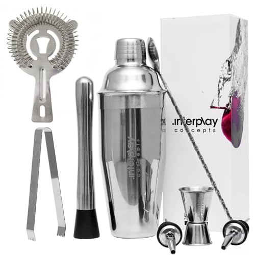 🥂 【Versatile, Multiple Uses】 This cocktail making kit is perfect for creating cocktail, mocktail, martini and pina colada at home or outdoors. Easy to use cocktail shaker and strainer is suitable for beginners, amateurs, or professional bartenders. Makes it easy to set up a bar at home or outdoors. Use the Interplay cocktail shaker to create any drink you want.