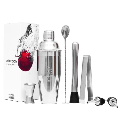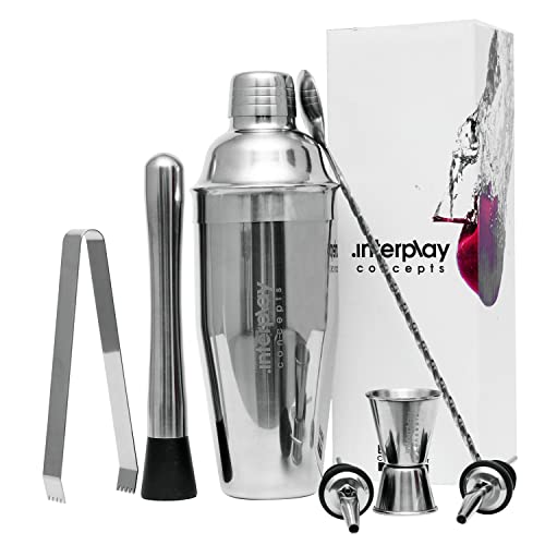 Cocktail Shaker Set, 8 Pieces Cocktail Set, Cocktail Shaker 750ml Large Stainless Steel with Jigger, Pourers, Tong, Muddler and Bar Spoon for Christmas Gifts for Him by Interplay Concepts
