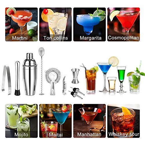 🥃【9 Pcs Essential Cocktail Shaker Set】1x Cocktail Shaker 25OZ/750ml,1x Double Jigger 0.5oz&1oz/15ml&30ml,1x Strainer,1x Bar Spoon, 1xMuddler,1x Ice Tongs,1x Corkscrew, 2x Pour Spouts.This drink mixer set provides most essential bar accessories you need for mixing delicious cocktails.