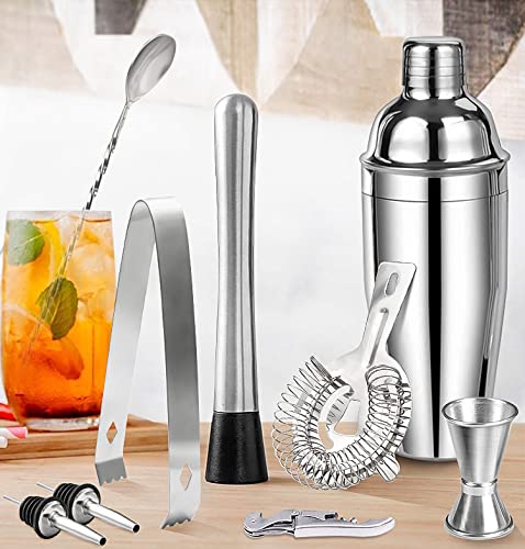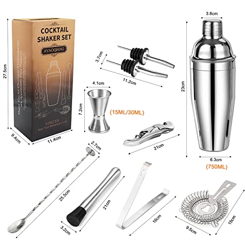 Cocktail Shakers Set,9 Pieces Cocktail Making Kit,Cocktail Shaker Set 750 Ml Stainless Steel Bar Tool Set Bartender Kit With Double Jigger,Pestle,Strainer,Pourers,Mixing Spoon,Ice Tongs,Corkscrew