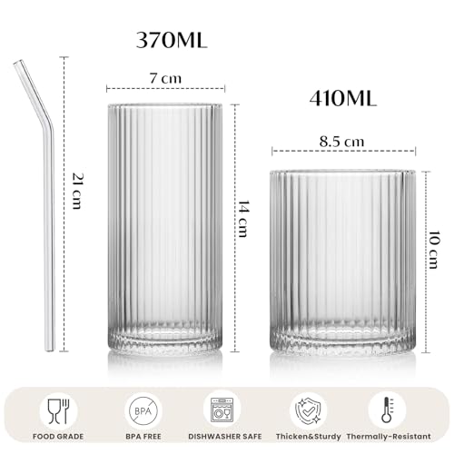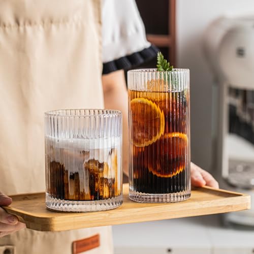 INSETLAN 8 Piece Ribbed Glassware – 4 Highball Glasses 12 oz, 4 Rocks Glass Cups 14 oz, Vintage Cocktail Drinking Glasses, Ideal for Wine, Juice, Water, Ice Coffee Cup, Whiskey, Mixed Drinkware