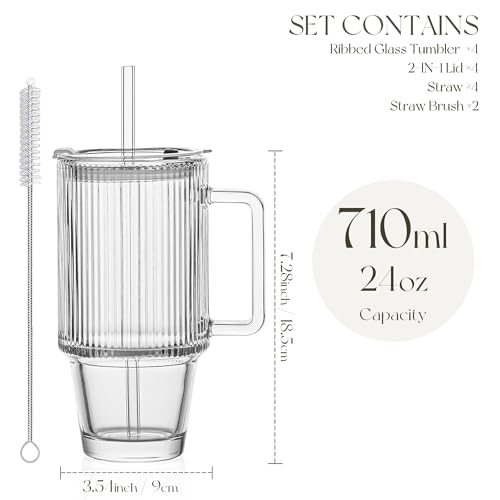 【4-Pack Glass Tumblers with Lids & Straws】 – Includes four 24oz ribbed glass cups, each with leak-proof lid & reusable straw – perfect for families, party supplies, restaurant drinkware, or bulk home use.