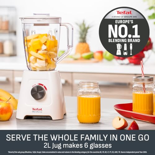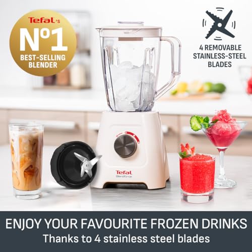 Tefal Blendforce II Blender, 2L Plastic Jug, 1.25L Effective Capacity, 600W, 4 Removable Stainless Steel Blades, Smoothie, Ice Crush, 2 Speeds + Pulse, Kitchen Shakes Maker, White, BL420140