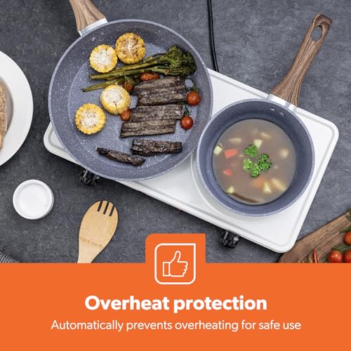 THERMOSTATIC ADJUSTABLE TEMPERATURE CONTROLS: The latest double hot plate is of 2000W high power with 5 levels of precise temperature control; Make heating much easier – With thermostatic control from simmering to boiling, heating has never been more easy or simple. Meet all your cooking needs such as to keep warm, boil water, cook pastas or steaks etc. Perfect for party, kitchen renovation, camping, Rv or dormitory or even brought to the campsite, it can provide you with cooking convenience.