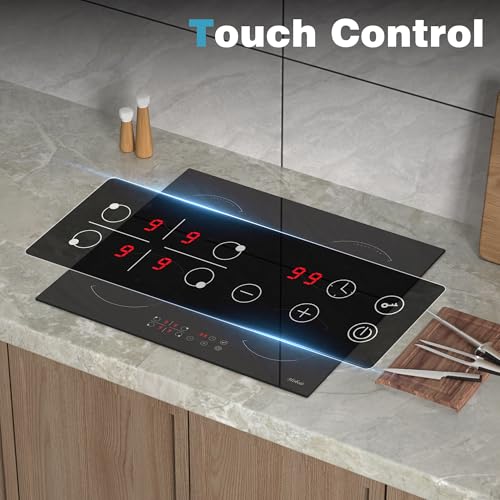 🔥【2800W 4 Zone Induction Hobs】Four high power burners – 1800W, 1400W, 1800W and 1400W with independent control panel.With touch control design, it is simple to control the electric hob with a simple touch of a finger. 9 Power Levels easily meet your daily cooking needs, such as boiling water, reheating sauces, boiling soup, frying steak, cooking pasta, grilling cheese and vegetables, etc.(Tip: Due to the power limitation of the plug (2800W), you can only use two heating zones at the same time.)