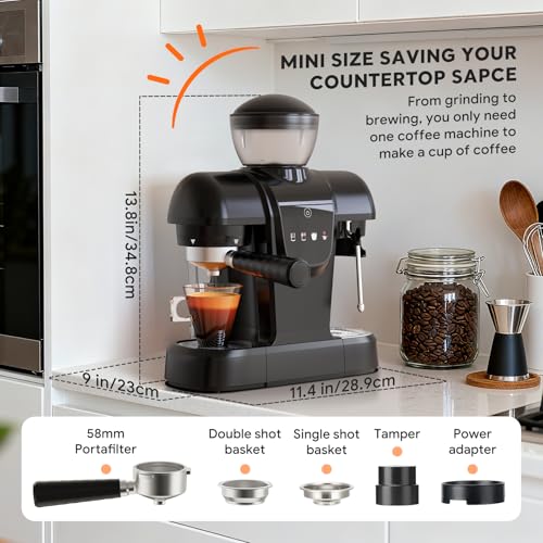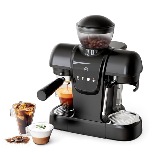 RECAFIMIL19 Bar Espresso Coffee Machine with Bean Grinder, 2 in 1 Coffee Maker for Ground Coffee, Cappuccino & Latte Maker with Milk Frother Wand, Touch Panel, Removable Tank, Black