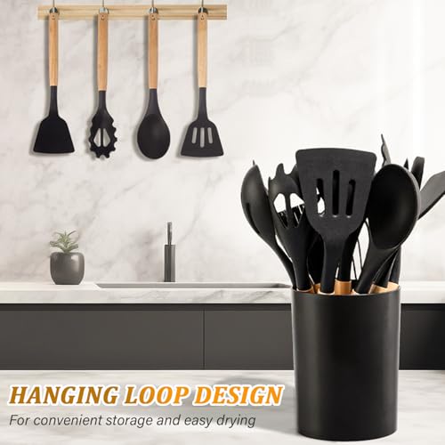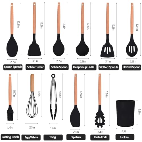 12 PCS Silicone Cooking Utensils Set with Wooden Handle, Kitchen Utensil Set, Heat Resistant, Nonstick Cookware Tongs Spatula Spoon Set, Dishwasher Safe, Best Kitchen Tools with Holder