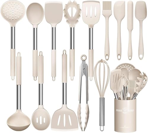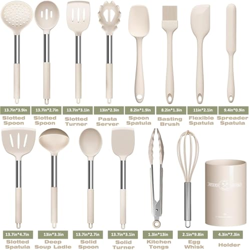 Kitchen Utensils Set, 15 Pieces, Silicone, Heat Resistant, Non-Stick, BPA Free, Stainless Steel Handle, Spatula (Khaki)