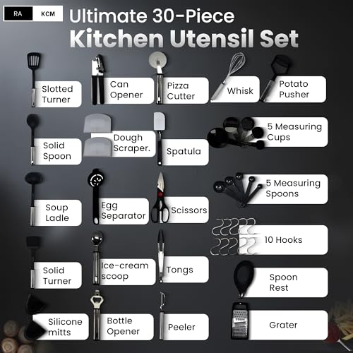 𝟑𝟎-𝐏𝐢𝐞𝐜𝐞 𝐀𝐥𝐥-𝐢𝐧-𝐎𝐧𝐞 𝐊𝐢𝐭𝐜𝐡𝐞𝐧 𝐔𝐭𝐞𝐧𝐬𝐢𝐥𝐬 𝐒𝐞𝐭 Includes solid spoon, soup ladle, turners, spatula, egg whisk, scissors, cheese grater, can opener, vegetable peeler, tongs, pizza cutter, measuring spoons & cups, and more – the ultimate kitchen set for everyday cooking!