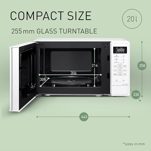 COMPACT 20L DESIGN: The space-saving 20L interior fits different dish sizes with a 255 mm turntable and stain-resistant acrylic grey cavity ensure easy cleaning and daily convenience.