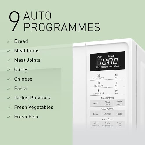 INTUITIVE AUTO PROGRAMMES: 9 sensor menus make tasks like defrosting meat or reheating leftovers simple with this compact microwave. Enter weight or portion details and the microwave sets correct times, removing guesswork.