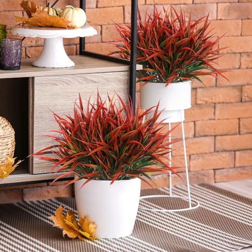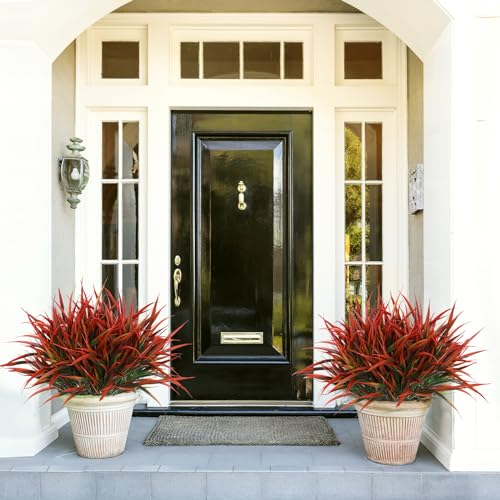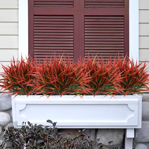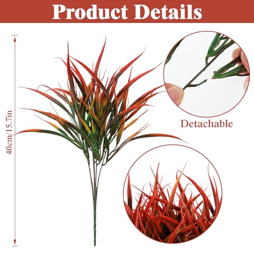 8pcs Artificial Grass Plants Outdoor Fake Grass Greenery Stems UV Resistant Faux Plastic Plants Shrubs for Spring Summer Home Window Garden Patio Box Pathway Front Porch Decor(Red)