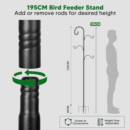 Adjustable Height Pole (up to 195cm):bird feeding station heavy duty’s height can be adjusted up to 195cm, Adjustable bird stand allowing you to hang items at different levels for a balanced display across various garden spaces and seasons.