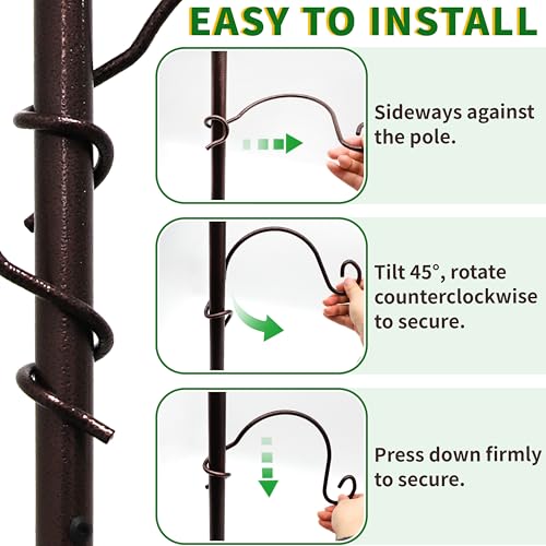 【EASY ASSEMBLY】The bird feeders hanging station is designed for effortless installation. The vine-style connections allow for quick and secure attachment of the hooks to the main pole with a simple twist motion, making this bird feeder pole easy to set up with included instructions and video guides.