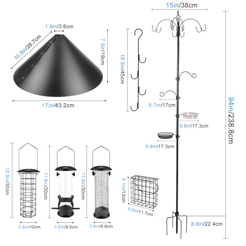 Double W hooks with Squirrel Baffle Premium Quality and Easy to Install: Rust resistant, sturdy steel pole stands 238.8 centimetre tall and 38 centimetre wide. Easily adjust components to any desired location of bird feeder poles stand by loosening and tightening wing nuts by hand. No tools required! Forked base prong adds stability and permits easy placement. Just step down to plant. Mesh tray and water bowl detach for easy cleaning