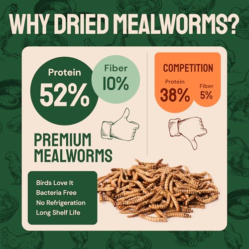 A Healthy Protein Source: Rich in crude protein (52%), crude fat (20%), crude fiber (10%), and top-grade edible oils, feel good knowing our dried mealworms for birds support healthy growth, feather development, and a strong immune system