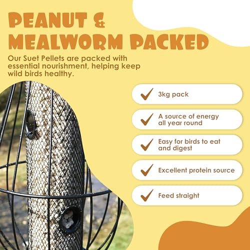 Peanut & Mealworm Suet Pellets, 3kg Resealable Tub – Wild Bird Food Enriched with Human Grade Beef Tallow, High in Energy & Protein – All-Season Bird Feed – Manufactured In The UK