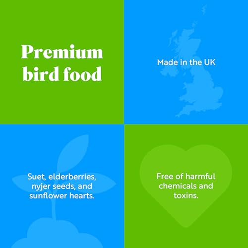 MADE IN THE UK: Wild bird feed with a nutritious mix of premium UK suet, elderberries, oil-rich nyjer seed, and sunflower hearts. Carefully crafted to ensure birds get the vital nutrients they need.