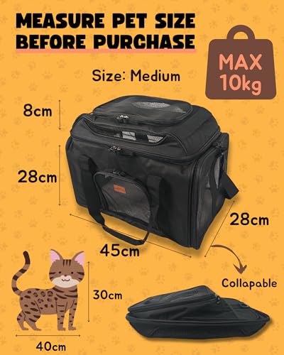 Travel confidently with your pet using this thoughtfully designed expandable cat carrier bag, ideal for cats, small dogs, and other small pets. Built for real-life use, it combines comfort, strength, and practicality — whether you’re visiting the vet or flying across the country. Crafted with durable polyester fabric, reinforced mesh, and a structural frame made of stainless steel and fiber rods, this soft-sided pet carrier holds its shape and stands up to frequent travel. It features mesh windows on all sides for maximum airflow and visibility, helping your pet feel secure and calm throughout the journey. The expandable top section gives your pet more headroom when needed — up to 12″ in Small and 14″ in Medium — while the built-in safety lead and locking zippers add extra peace of mind. An included plush fleece bed keeps your pet cozy and is removable and washable for easy care. Designed to fit under most airline seats, this lightweight and foldable airline-approved pet travel bag also comes with a padded shoulder strap for easy carrying. Available in: Small: For pets under 7kg Medium: For pets under 10kg We recommend measuring your pet’s length and height for the best fit. Whether you’re looking for a cat travel carrier, kitten bag, or small dog carrier, this bag is built to deliver comfort, durability, and convenience — every step of the way.