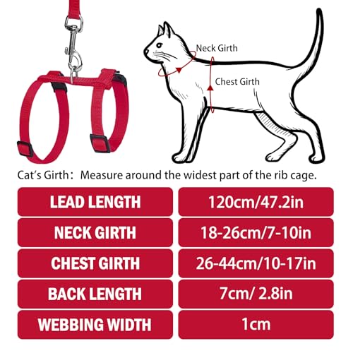 Neck size: adjustable from 18cm – 26cm, Chest size: adjustable from 26cm -44cm, Lead length: 120cm, Lead length: 150cm, please measure your cat carefully and refer to the size chart before placing an order