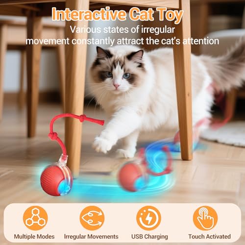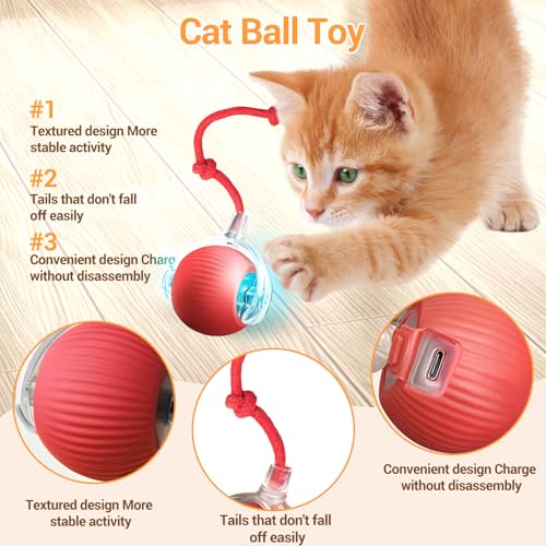 Interactive Cat Toy Cat Ball Toy USB Rechargeable Self-MovingBall Stimulate Cats’ Hunting Instincts Automatic Moving Ball with Tail With 3 Modes(Red)