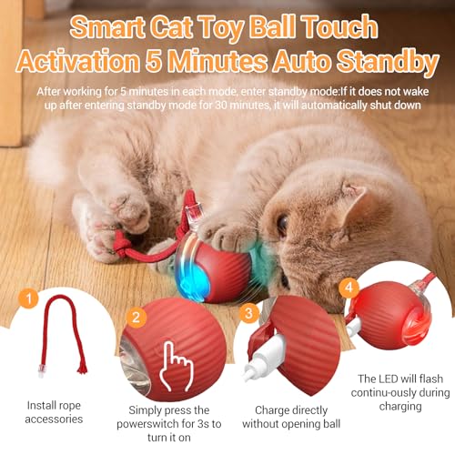 USB Rechargeable Battery: The smart cat toy ball has a built rechargeable battery When the ball light colour flashes red which can be recharged via the included USB charging