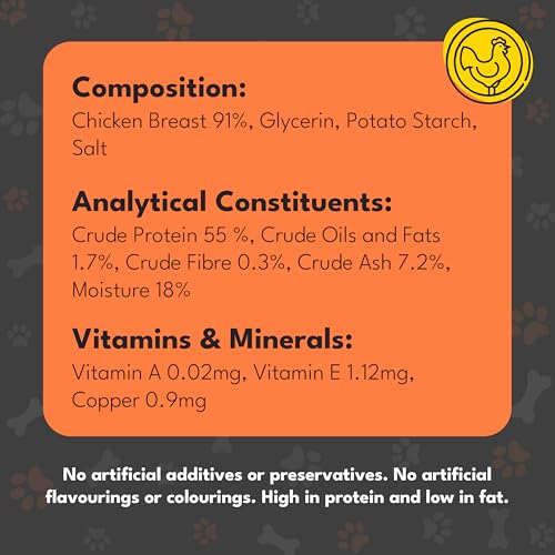 Quality Real Chicken This premium gourmet treat is made with 100% natural premium, human grade, chicken breast meat. These tender strips of chicken can be given as a chew, and are easy to break up for training and rewards. Naturally high in protein and low in fat and salt, delicately roasted to perfection in their own natural juices. No artificial flavours or colours. Wheat, soya and gluten free. What better way to let your dog have a treat, that is made with the finest natural ingredients.