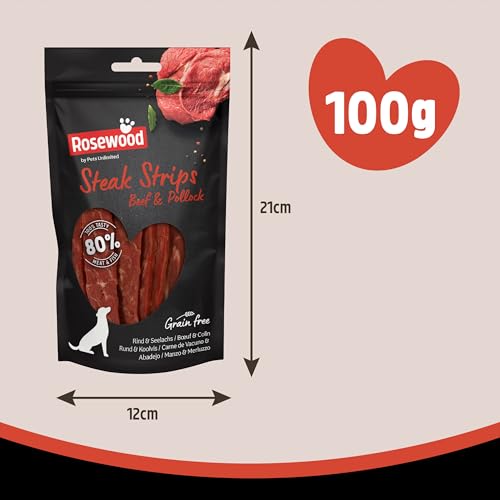 Rosewood Steak Strips for Dogs – Made with Beef and Pollock, Grain Free Chews, High Protein Dog Treats, By Pets Unlimited (100g)