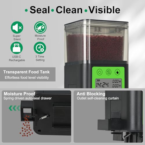 【Moisture-Proof Design】- Top opening food box is not only a good idea to easy observation of food inventory and add fish food, but also prevent the food from moistured. Also, the feeding bin will automatically close after feeding to keep the fish feeder fully sealed. Your fish food will always keep dry and fresh.