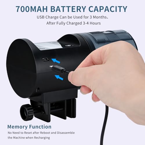 【USB Rechargeable】- The battery capacity is 700mAh which takes 3-4 hours to complete the charging. According to different settings of feeding, the automatic fish feeder can be used for 2-4 months when it is fully charged. No need to buy batteries repeatedly, which is energy saving and environmental protection.