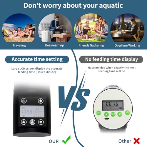【Accurate Time Display】- Unlike other fish feeders, the Podazz new version fish feeder will display the accurate time (hours: minutes) and can record and display the feeding time you set to prevent you from forgetting. This automatic fish feeder can feed up to 3 times a day, with 1-3 meals per feeding. Simply set feeding times on your demands.