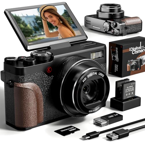 Digital Camera, 48MP Cameras for Photography, 4K Vlogging Camera for YouTube, 180°Flip Screen Digital Point and Shoot Camera with 18X Zoom, Compact Camera for Beginner with 32GB Card(2 Batteries)