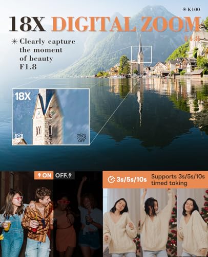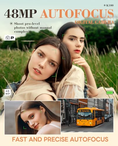 · 【4K Autofocus Cameras for Photography】This digital camera has an autofocus function. In photography mode, gently press the capture button to keep the camera stable. The camera will automatically focus on this point, and a green box will appear to indicate successful focusing,making it easy for both beginners and kids. In addition, the digital camera supports 18x digital zoom, allowing you to easily capture distant objects.