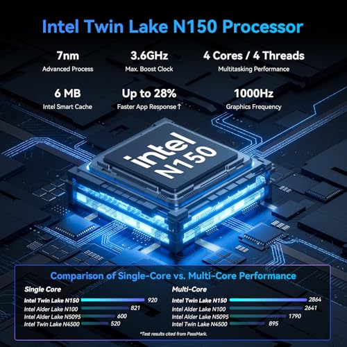【🚀 High-Performance Processor】 Powered by the latest N150 processor (4 Cores, 4 Threads, up to 3.6GHz turbo frequency), delivering over 30% faster response times and overall performance compared to previous N95/N100/N5095/N4500 chips. Tasks load rapidly, and parallel multitasking runs effortlessly, ensuring stable operation even in demanding scenarios. The ultra-low 6W power consumption design guarantees maximum performance output during intensive use, preventing overheating, thermal throttling, and stuttering.