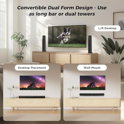 Versatile Placement Designs: Whether assembled as a soundbar or separated into two tower speakers, it can be wall-mounted or placed on a TV stand or desktop. Comes with an intuitive remote control and onboard buttons for easy operation—plug and play instantly.