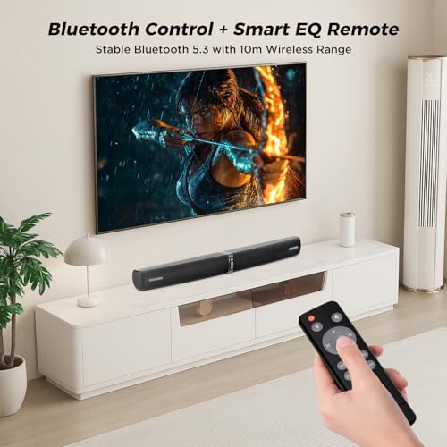 Three EQ Modes: Equipped with advanced DSP technology, this soundbar offers three tailored sound modes compatible with smart TVs, PCs, gaming consoles, projectors. Whether you’re listening to music, watching movies, or enjoying podcasts, it ensures an immersive high-fidelity audio experience.